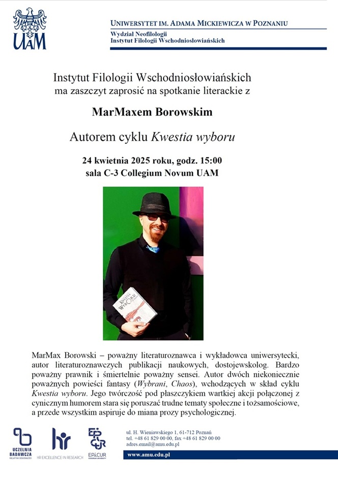 Niedawno miałem przyjemność gościć na UAM jako literaturoznawca, teraz będę – dzięki inicjatywie Instytutu Filologii Wschodniosłowiańskich – występować jako [wymawiać w myślach z nabożną czcią] PISARZ. Serdecznie zapraszam Poznaniaków i każdego, kto ma ochotę:)