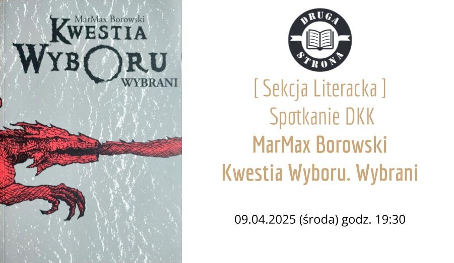 W środę 09.04.2025, o 19:30, Sekcja Literacka Klubu Fantastyki Druga Era serdecznie zaprasza na spotkanie z książką: „Kwestia Wyboru. Wybrani” oraz jej autorem MarMaxem Borowskim!